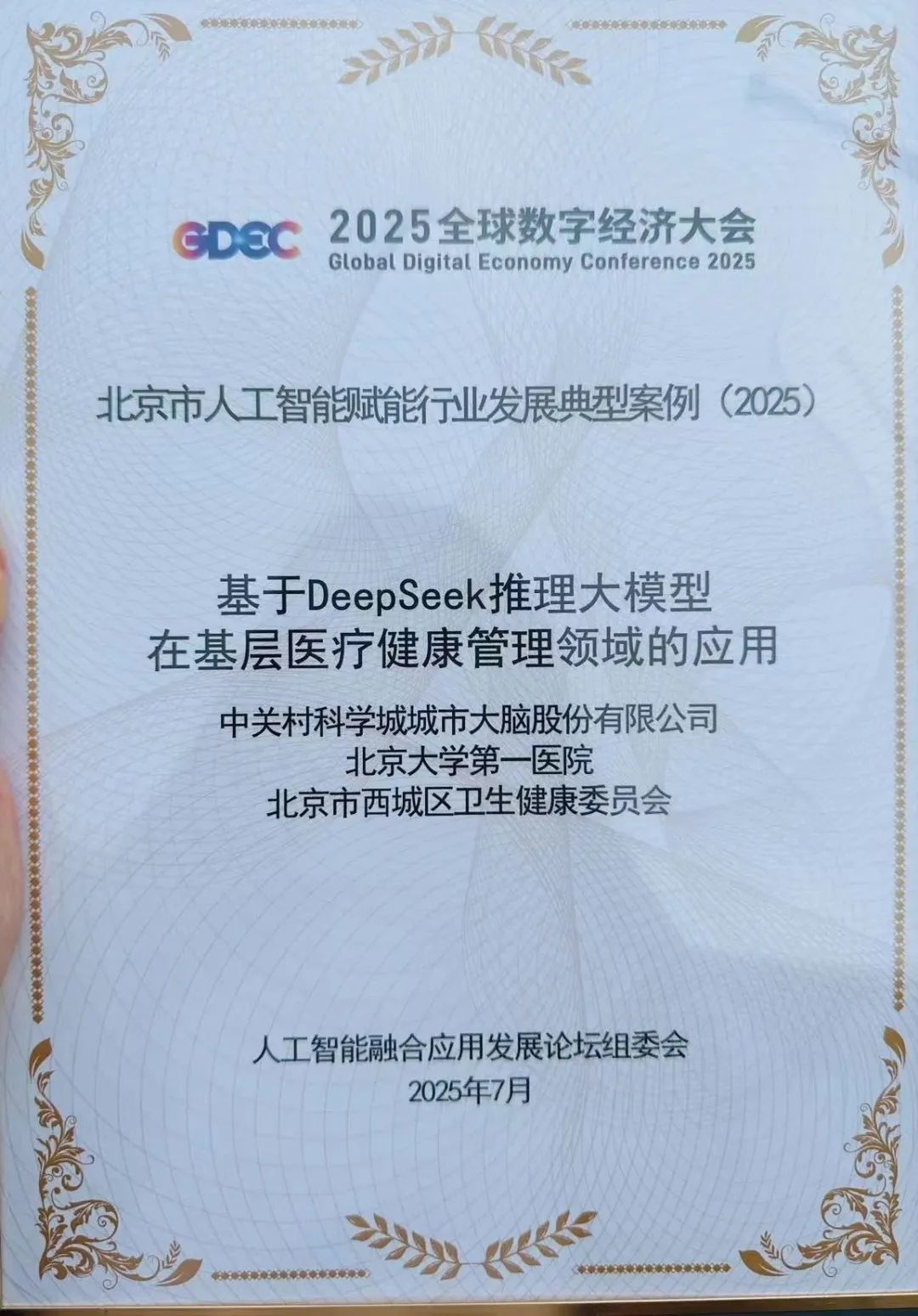 中科大腦構(gòu)建的“基于DeepSeek推理大模型在基層醫(yī)療健康管理領(lǐng)域的應(yīng)用”入選“北京市人工智能賦能行業(yè)發(fā)展典型案例”。平臺融合權(quán)威的臨床知識、專家經(jīng)驗(yàn)、高質(zhì)量的醫(yī)學(xué)數(shù)據(jù)和居民全生命周期健康數(shù)據(jù),構(gòu)建了居民電子健康檔案、AI預(yù)診、輔助決策支持、健康指導(dǎo)等一體化智能服務(wù)。